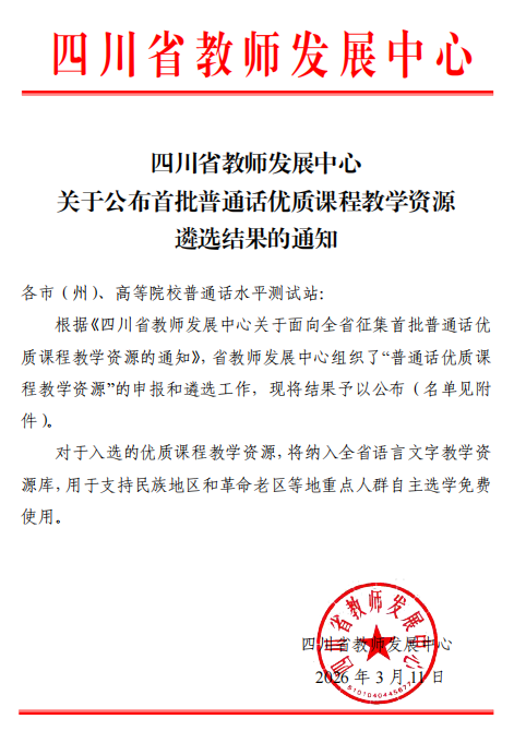 近日,四川省教师发展中心公布首批普通话优质课程教学资源遴选结果,我院教师邓雅兮报送的《普通话正音...