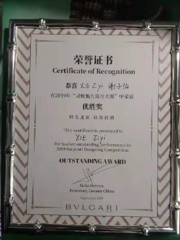 据悉,本次设计比赛为宝格丽第一届校企合作设计大赛,在与四川美术学院等数所院校的激烈角逐中,郭为民、谢子怡获得优胜奖。在颁奖时,宝格丽首席执行官Mr. Jean-Christophe Babin对同学们的设计天赋表示大力赞赏,对同学们的到来表示热烈欢迎,并希望有机会与同学们签署合作协议,将设计图稿生产为真实产品。