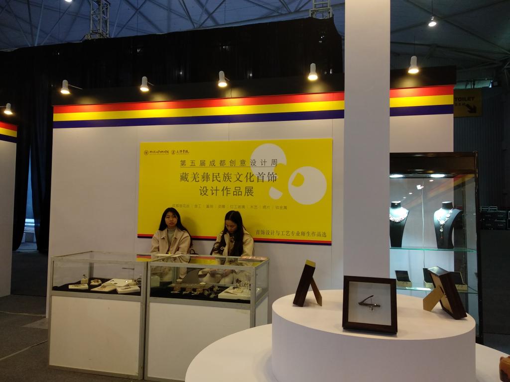 11月9日至12日,由成都市人民政府主办的第五届成都创意设计周,在成都世纪城新国际会展中心举行。本届创意周展览会设立城市空间、工业设计、旅游文创、乡村艺术四大展馆,文博学院师生藏羌彝民族文化首饰设计作品亮相藏羌彝文创产业走廊创意展。