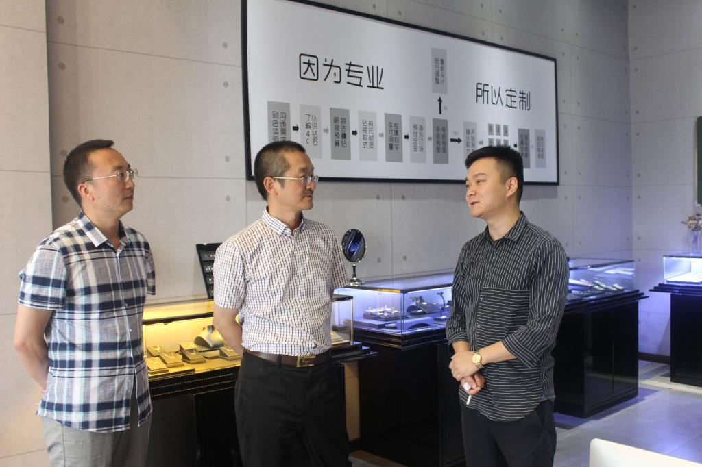 仪式结束后,李太斌一行冒雨驱车前往雅安市区调研我院2012届、2013届两位“珠宝首饰工艺及鉴定”专业毕业学生何剑、唐晓杰所创办的“钻定一生”私人首饰定制工作室的创业情况。李太斌对 我校毕业学生能够在短短2年时间内,创出自己的品牌、在四川开设8家分店,还帮助10余名珠宝专业师弟师妹成功创业,给予了高度肯定,并当即联系雅安电视台学校校友、新媒体负责人,要求他们通过新媒体给予宣传报道。
