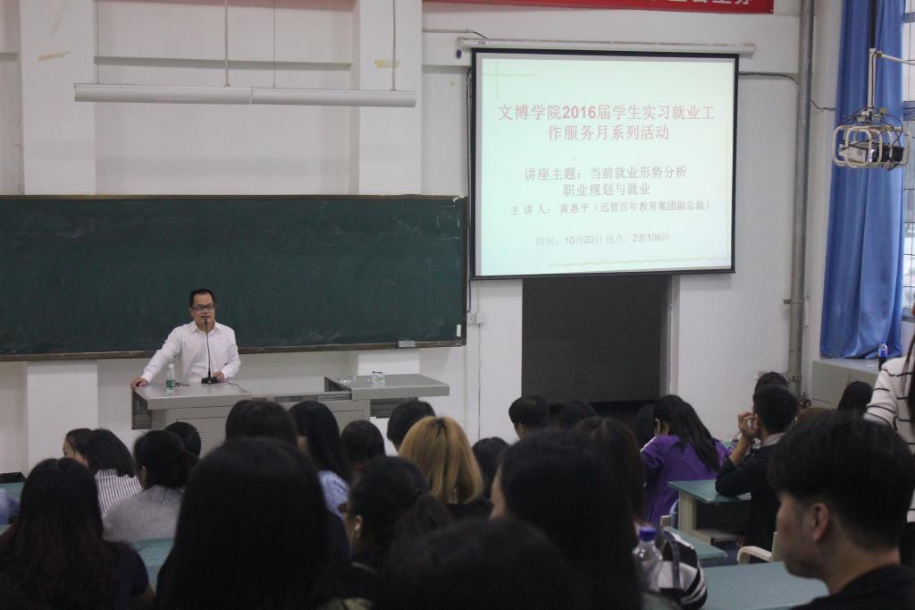 为稳步推进学生实习、就业工作,提升学生实习就业信心。2015年10月,文博学院对外合作交流中心邀请知名企业高管、创业领袖、就业精英来校开设系列实习、就业指导专题讲座,其中包含“大学生就业政策法规专题讲座”、“当前就业形势与职业规划专题讲座”、“大学生就业心理调适专题讲座”、“哈伯逊人文公益讲座”等。通过以上讲座,使学生充分认识了当前就业形势;了解了就业政策;并逐步增强了就业自信心。