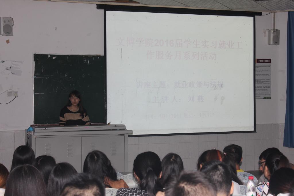 10月14日下午,为了帮助毕业生准确有效地了解就业政策,确定就业方向,尽快让学生在思想上与行动上做好就业准备,文博学院在一教一阶举行了“认清环境掌握政策,抓住职场主动权”——大学生实习就业政策法规专题讲座,全院2016届毕业生参加了专题讲座会。