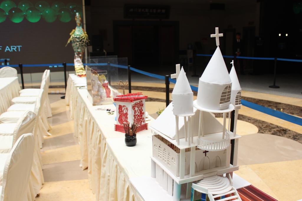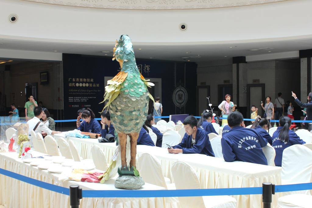 本次活动分为作品展示和现场体验两个部分。首先,上午10点开始在四川博物院的一楼大厅展示了文博学院文物鉴定与修复专业大量的学生作品,这些作品均为学生在课余时间利用身边废旧物品动手改造,其中不乏优秀之作,比如废旧报纸、铁丝、卡纸制作的凤凰,废旧包装塑料制作的静态展示,还有卫生纸、铁丝、空酒瓶制作的插花艺术品等等,这些作品都体现了学生丰富的创意以及严谨的动手能力。