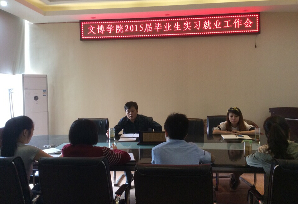 2014年9月26日上午,我院在创慧楼会议室召开了2015届毕业生实习就业工作布署会议,文博学院对外合作交流中心、学生科、教务科部门负责人及2015届辅导员、实习就业干事参加了本次会议。