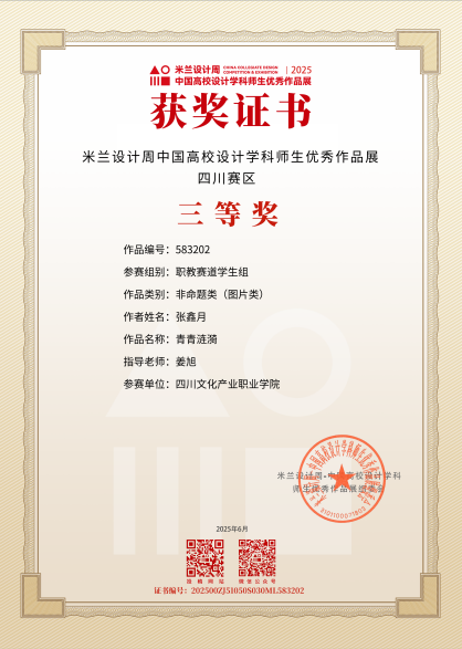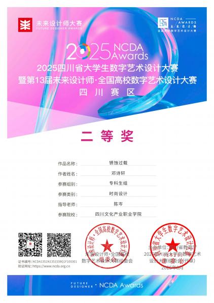 近期,2025年度教育部《全国普通高校大学生竞赛排行榜》艺术设计类竞赛落下帷幕,服装与服饰设计专业23级邓诗轩荣获“未来设计师·全国高校数字艺术设计大赛(NCDA)”省赛二等奖,22级张鑫月、但颜君分获“米兰设计周-中国高校设计学科师生优秀作品展”和“东方设计奖·全国高校创新设计大赛”省赛三等奖,教师陈岑荣获优秀指导老师。