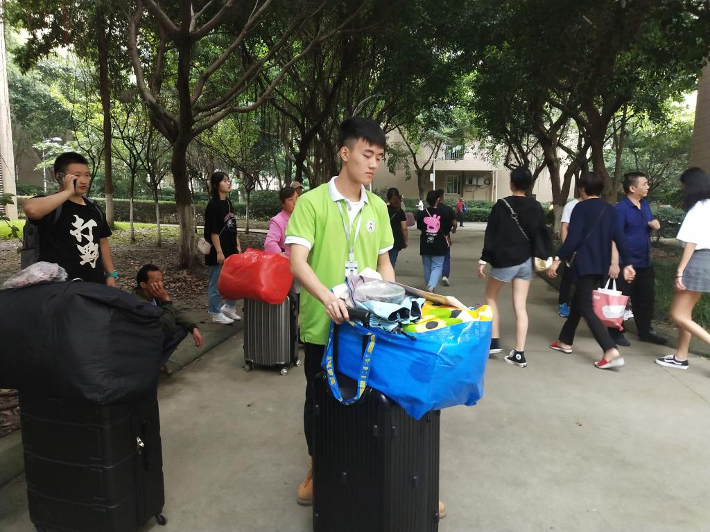 学长学姐们热情的态度,带着新生们办理入学手续,拉皮箱、搬行李忙的不亦乐乎。